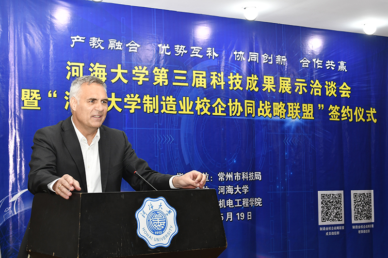 张兵在致辞中,对作为第十三届中国常州先进制造技术成果展示洽谈会系列活动之——河海大学第三届科技成果展示洽谈会暨河海大学制造业校企协同战略联盟签约仪式的举办表示热烈祝贺,对常州市各级政府及各位企业家对我校的信任与支持表示衷心感谢。他指出,制造业校企协同战略联盟的成立,旨在“推进产教融合、深化协同培养、促进协同创新、实现互利共赢”,这是校企合作新模式的又一次积极探索。希望以此次战略联盟的成立为契机,深入探索人才培养、科研合作、成果转化等校企合作新模式,充分发挥企业创新主体的项目资源优势和我校创新要素的集聚优势,为高校和地方产教融合谏言献策、为校企深度合作提供思路对策,努力将联盟打造成为全省乃至全国校企协同的成功典范。
