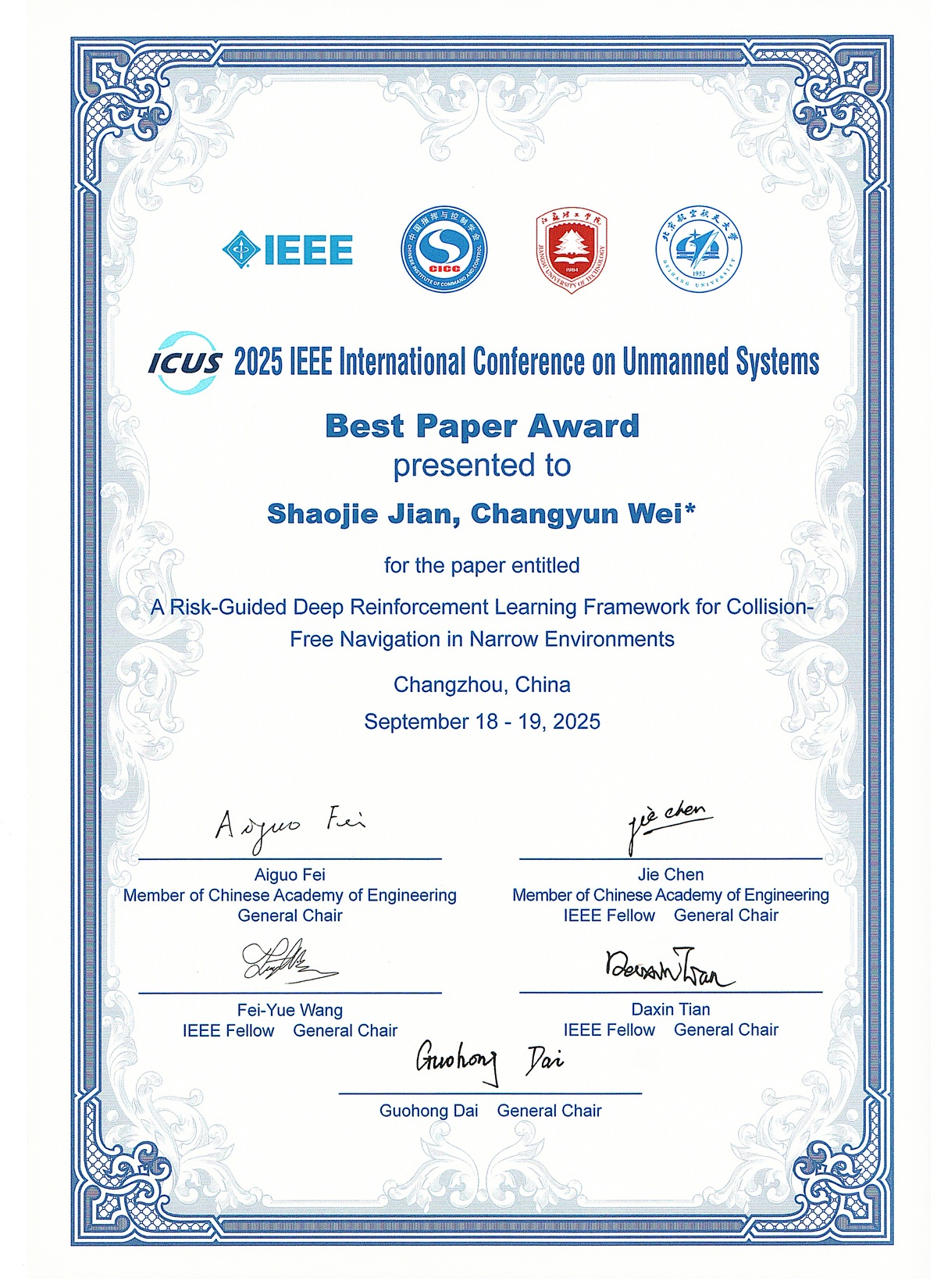2025年9月18-19日,由中国指挥与控制学会、IEEE 南京分会主办,中国指挥与控制学会无人系统专业委员会承办的 2025 第八届 IEEE 国际无人系统大会(ICUS 2025)在江苏常州召开。机电工程学院硕士研究生简少杰(导师:魏长赟教授)以第一作者身份发表的论文,荣获大会最佳论文奖,论文题目为《A Risk-Guided Deep Reinforcement Learning Framework for Collision-Free Navigation in Narrow Environments》。
