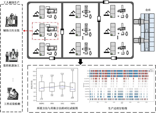为解决这一关键瓶颈,我院顾文斌教授团队提出了一套系统性的建模与求解框架。团队首先从人的生理与行为特征出发,构建了能够量化人员状态的效率函数,并在此基础上建立了兼顾人机协同关系的具有不相关并行机的混合流水车间的实时调度问题(HMHFSP-UPM)的数学模型。随后将问题形式化为马尔科夫决策过程(MDP),并设计了面向人机协同的实时调度流程、交互点、实时生产状态、调度动作库与基于完成度的奖励机制等五大要素。为保障在线决策的稳定性与泛化能力,团队进一步提出了一种基于分布式柔性动作—评价的训练算法,使智能体能够在关键交互点自适应选择最优调度动作,兼顾生产效率与人因约束。