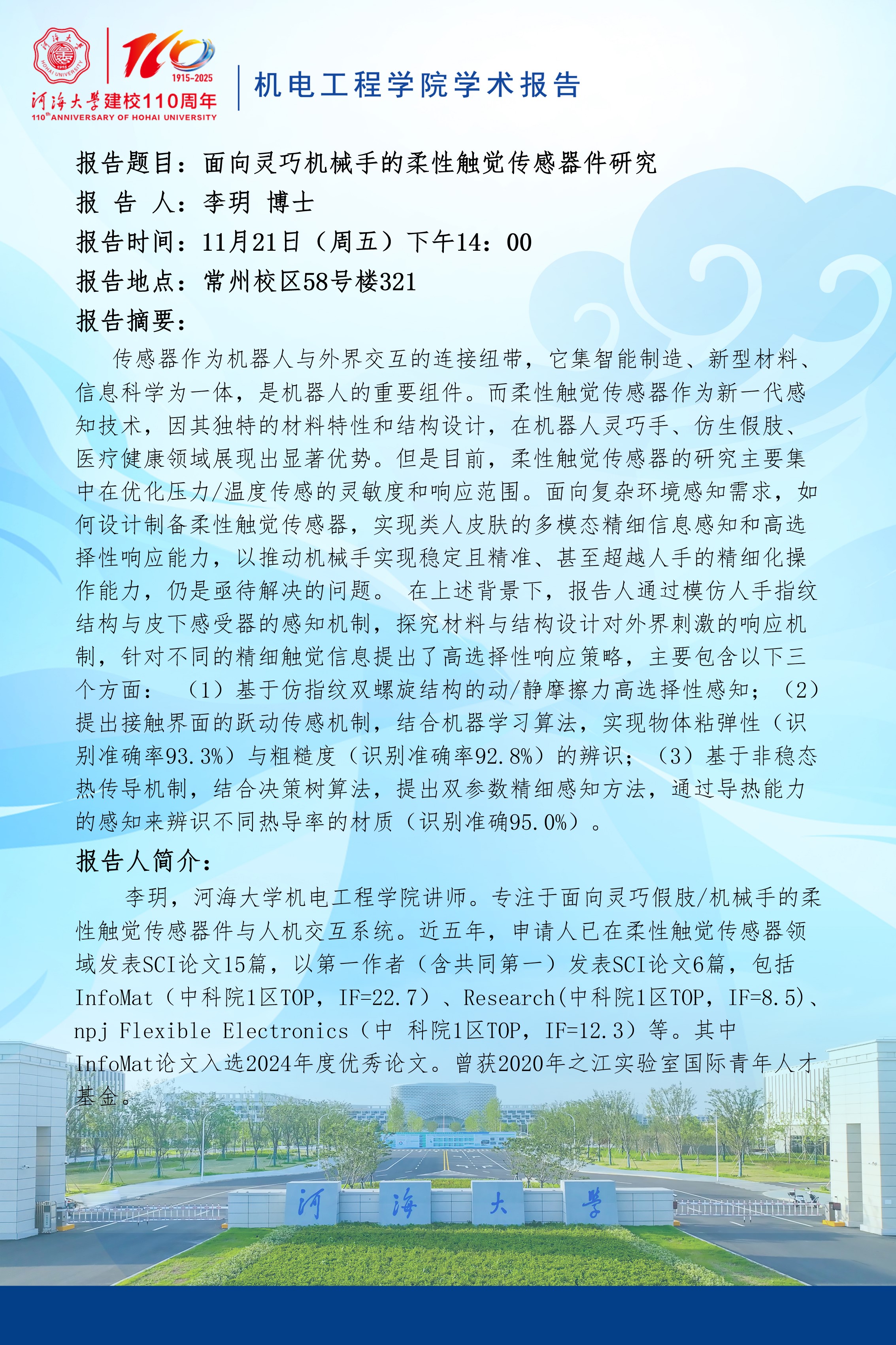 学术报告:面向灵巧机械手的柔性触觉传感器件研究